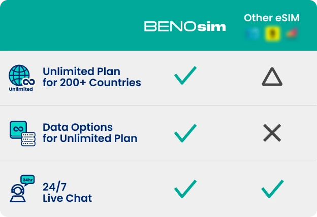 BENOsim offers the perfect travel eSIM with powerful unlimited data and reliable support